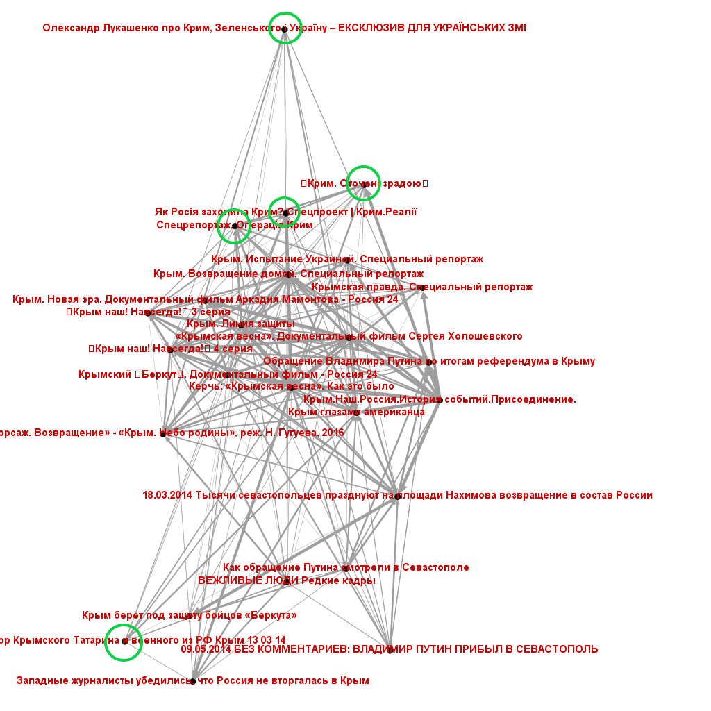 For the first data collection, fifteen starting videos were manually selected by the author using the YouTube search function. They had to be relatively short (under 20 minutes), seven of them represented a clearly positive attitude towards the annexation, seven evaluated this event negatively, and one video represented an ambivalent perspective. Collected recommendations were manually annotated. Two independent annotators watched all recommended videos in full length and evaluated such parameters as relevance, evaluation of the annexation, language, topic, and category. In addition, the presence of actual topics, such as the increasing issue of the pandemic and various anniversaries, among them the anniversary of the Crimea annexation, was marked in the dataset.